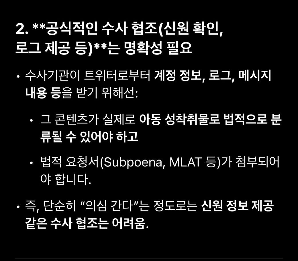 트위터에 올라온 교복물이 컨셉 때문에 제목이 학생등의 게시 할 것인데 단순히 학생 컨셉일수도 있는 상황이고 신체 발육 상태도 아동 같지 않고 얼굴도 나오지 않고 피해자가 있는 상황도 아닐 경우 명백히 아동 청소년이 아닌데 해외 기업이라 협조도 쉽지 않을 것인데 이럴 경우 명백하게 아청물도 아닌데 수사에 협조 하기가 쉽나요?