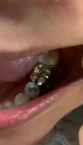 (교합조정을 위해 인위적으로 부자연스럽게 깍아놓은모양과 무언가 뽀죡한것에 찍인 점들-골드크라운전체의 잔기스들등 기존의 사용감이 그대로 있는 기존의 크라운)