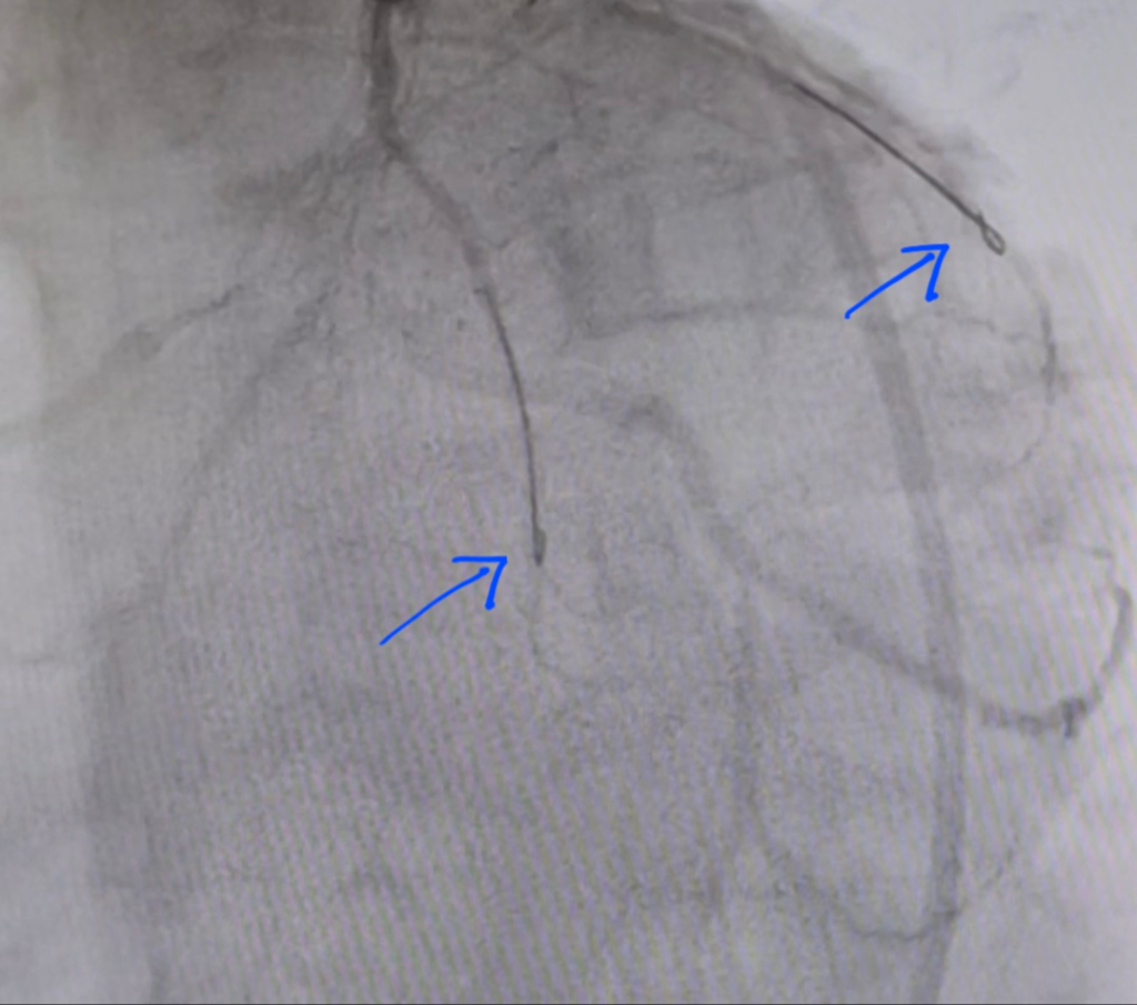 시술과정에서 스텐트를 삽입하기 위해서는 가이드 와이어 등을 넣게 되는데 그 가이드 와이어 등으로 보여집니다.