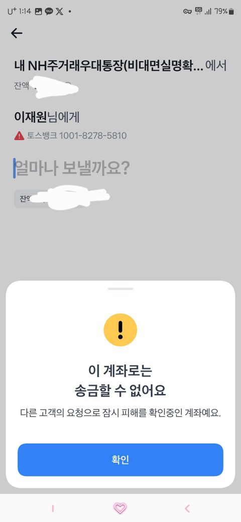 이 계좌로는 송금할수 없어요 다른 고객의 요청으로 잠시 피해를 확인중인 계좌에요. <-라고 뜨는데 이렇게 뜨면 이 계좌의 출금도 막힌건가요?