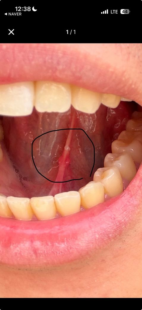 사진상 가운데 붉은 부위는 설소대 바로 옆 점막에 얕게 헌 듯한 미란(표재성 점막 손상) 형태이고, 양옆의 봉긋한 구조는 투명한 액체가 차 있는 수포라기보다는 정상 점막이 부어 보이거나 소타액선이 일시적으로 도드라져 보이는 양상에 가깝습니다. 실제 물집이라면 맑은 액체가 비쳐 보이거나 쉽게 터진 흔적이 동반되는 경우가 많습니다.