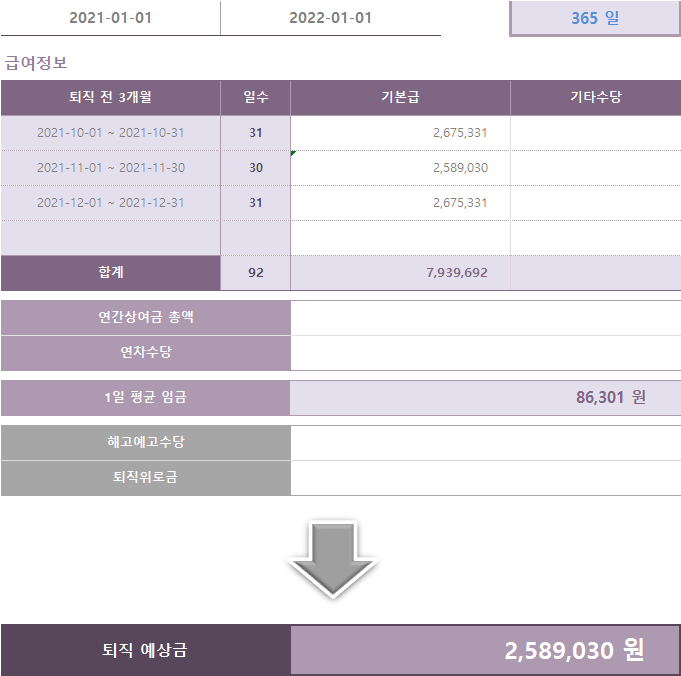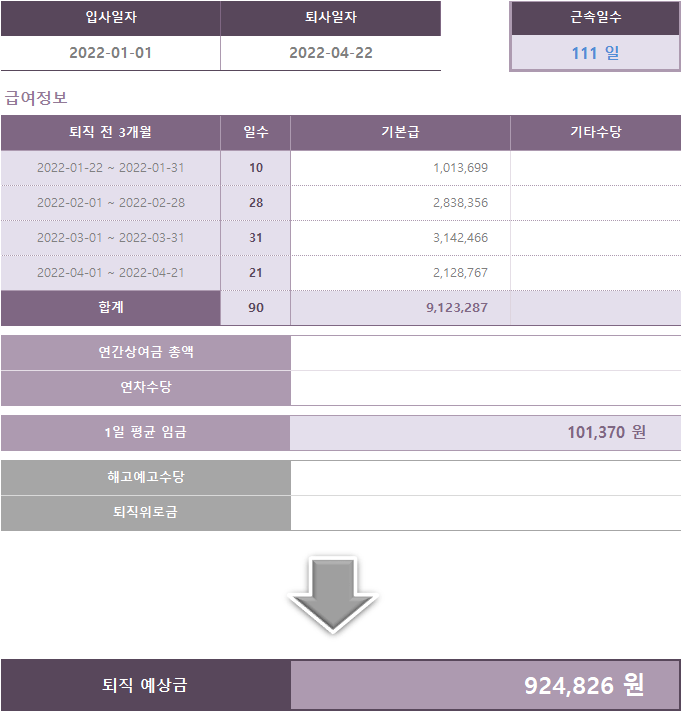 위에 기재한 계산 방식으로 전체 근로 기간(2019. 08 ~ 2022. 04. 21)에 대한 퇴직금 계산을 하여 정산했다고 답변 받았습니다.