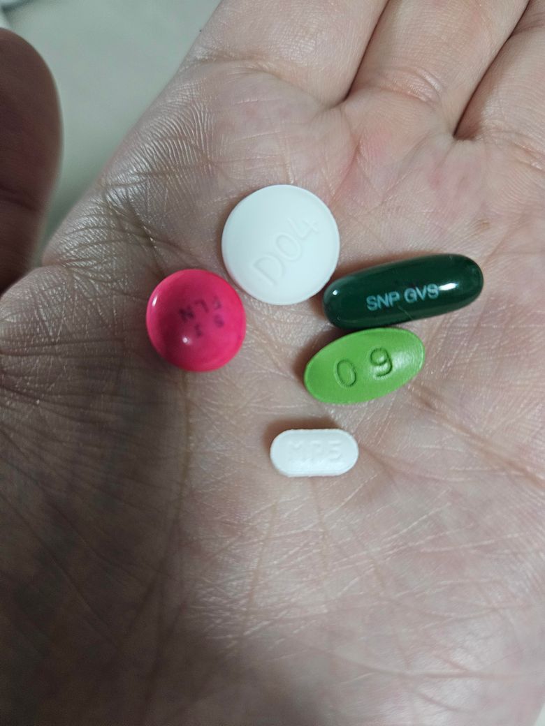 약의 식별을 하기 위해서는 앞뒷면을 다 제공해주셔야합니다. 초록색 연질캡슐은 가베스판 연질캡슐, 빨간색 정제는 푸로시놀정으로 식별 할 수 있습니다. 이외의 약은 정보가 부족하겠습니다.