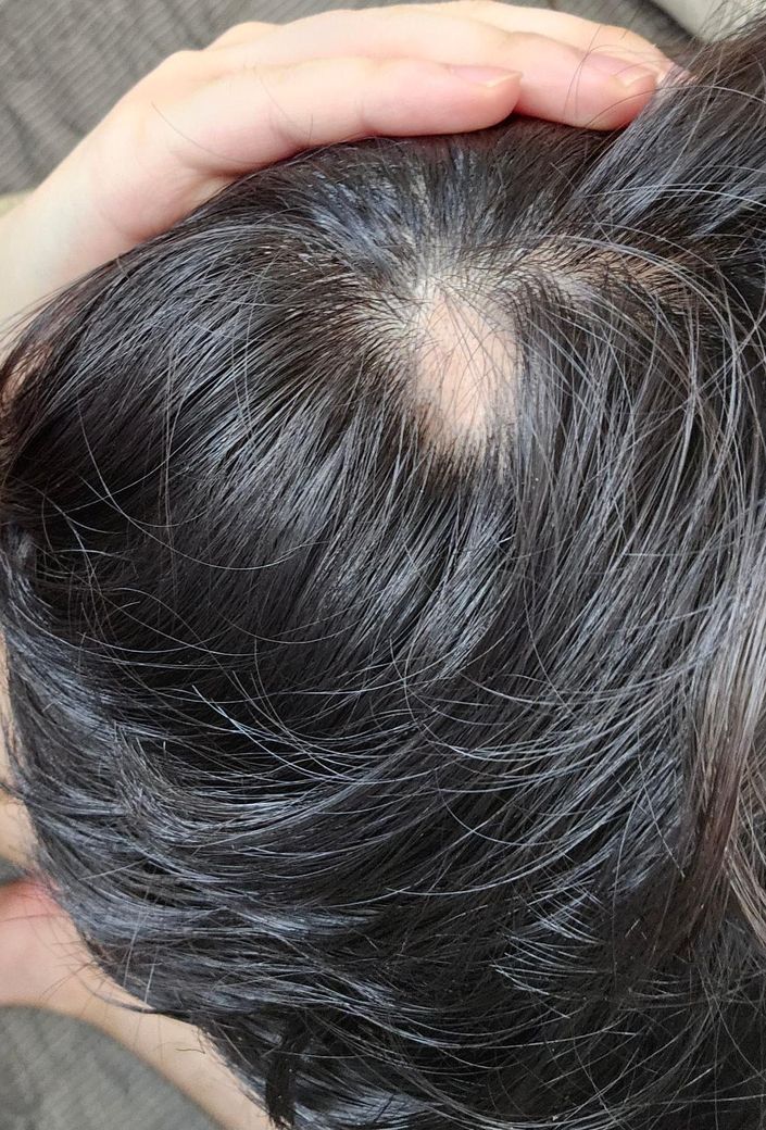 사진을 보면 정수리 근처에 경계가 뚜렷하고 동그란 형태로 머리카락이 빠진 부분이 있습니다. 이처럼 갑작스럽게 생긴 국소적인 탈모는 원형탈모를 의심할 수 있습니다. 이는 자가면역 질환의 일종으로, 스트레스나 수면 부족, 불규칙한 식습관, 유전적 소인 등 다양한 요인이 영향을 미치는 질환입니다. 치료를 통해 완치를 기대할 수 있으니 가까운 피부과를 방문하여 진료받아보시기를 권해드립니다.