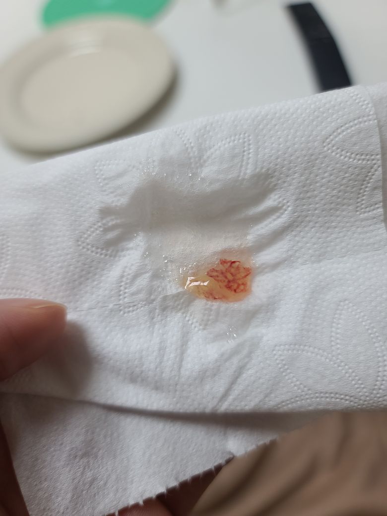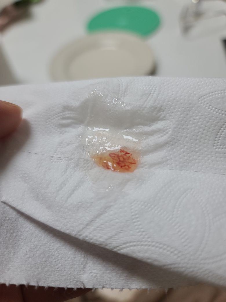 코와 입이 연결된 윗쪽,뒷쪽이 묵직하게 막혀있어서 입을통해 빨아들여 뱉었는데 피가 이렇게 섞여 나온건 처음이에요.