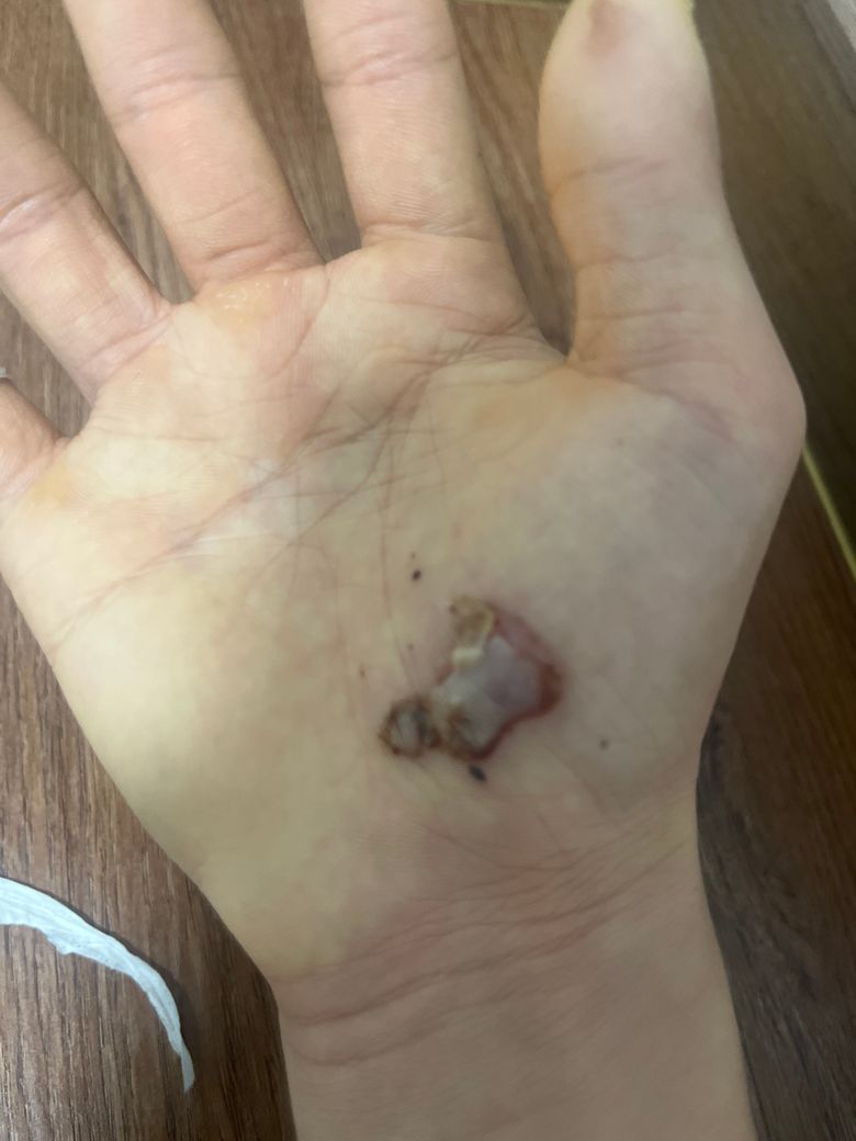 킥보드타다가 넘어졌는데 손바닥 살이 까지면서 까진 윗부분 살이 벗겨졌는데 최대한 빨리 낫는법 있을까요..? 엄지손톱정도 까졌어요