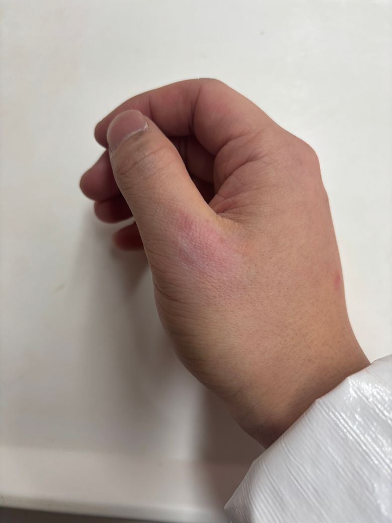 엄지 손가락의 통증과 손등 쪽 관절 부위의 발적, 뻑뻑한 느낌은 관절염의 증상일 수 있습니다.