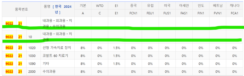 예를들어 제9022.21-1090의 경우 WTO 협정관세 적용으로 인한 0%관세 적용이 가능합니다.