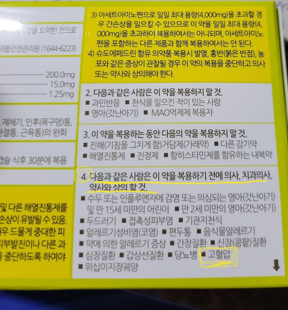 슈도에페드린성분이 지속적으로 복용시 혈압이 높아져서 경고문구가 들어가있는것이고 일시적으로 드시면 문제업습니다.