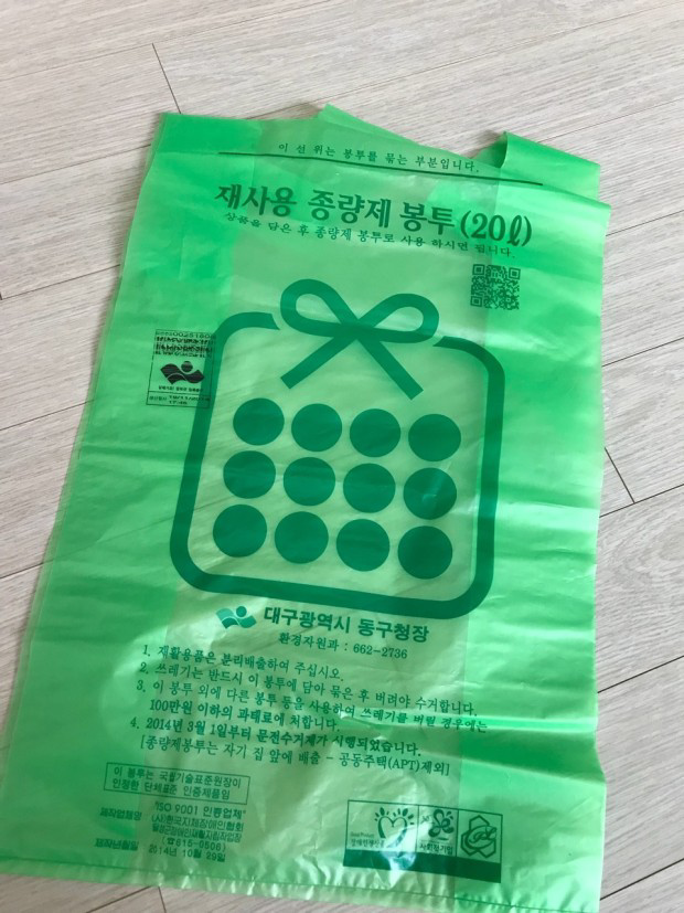 재사용 종량제봉투는 마트에서 물건 구입 시 일회용 비닐봉투 대신 장바구니로 사용한 후 쓰레기봉투로 재사용하는종량제봉투이입니다. 재사용 종량제봉투의 사용 활성화를 위해 동종 용량의 일반 종량제봉투보다 조금 저렴하게 판매하고 있습니다.