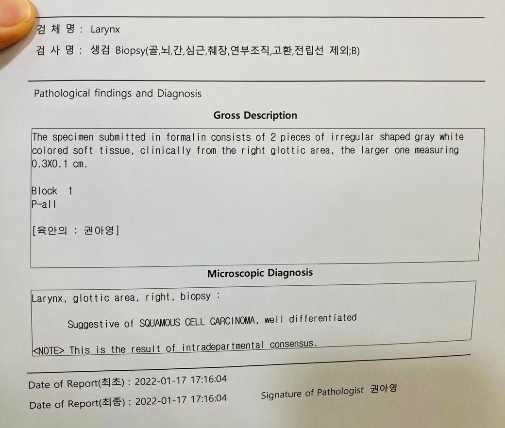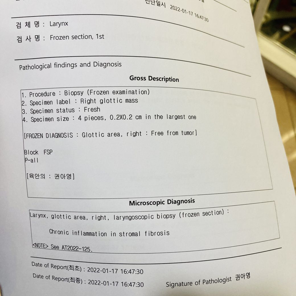 아버지가 기관지내시경을 통해 성대에 종양이 있다고 하여 조직검사를 하였는데 성문암이라고 합니다. 아무런 지식이 없어 자식으로써 위로를 드리지 못하는 상황입니다.