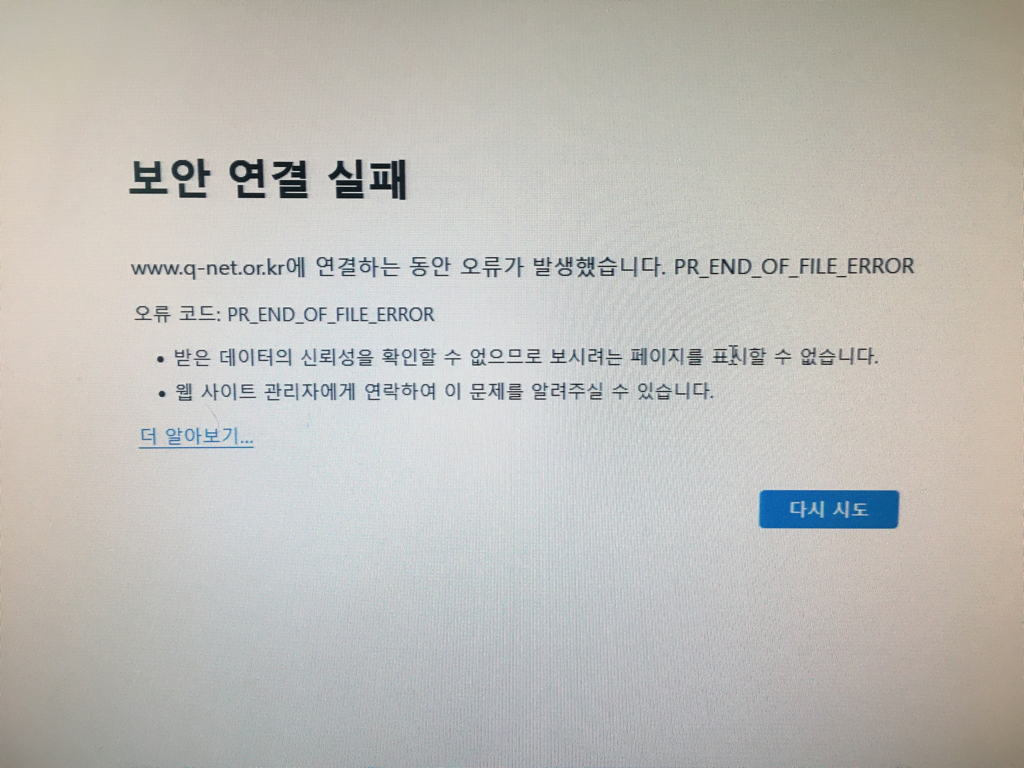 오늘 시험접수날이라서 q넷 홈페이지에서 시럼접수를하려고했는데 아까 9시쯤엔 멀쩡했는데 10시땡하니까 접속자수가 많아서인지 어째서인지 먹통이되고 저따위 알림이 뜨는데 어떻게 해결해야할까요??