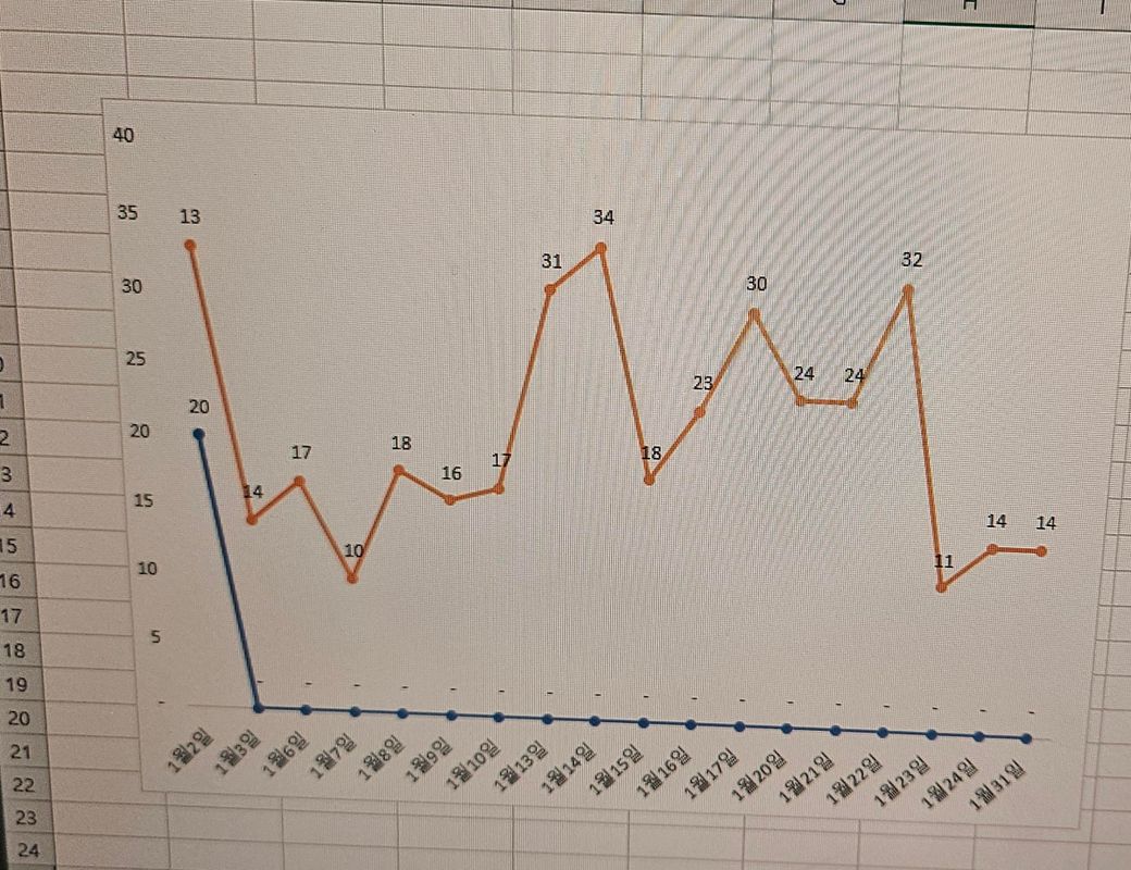 13이 꺽은 그래프 시작하는 데이터이고 다른 숫자는 다 세로축의 숫자줄에 맞춰서 표시되는데 13만 혼자 높게 올라가 있는데 원인이 뭔지 모르겠어요