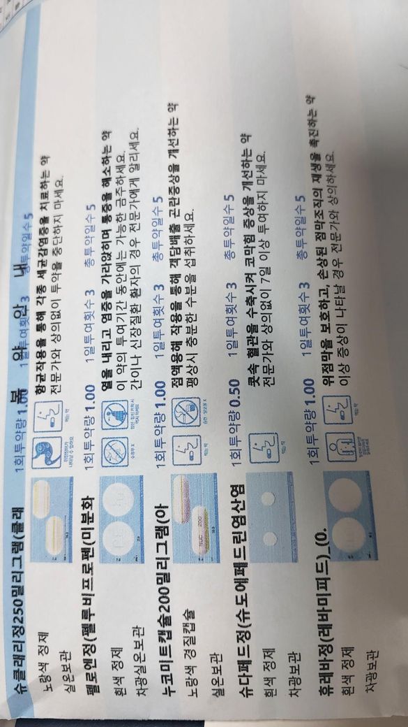 사진 속 처방은 슈클래리정 250mg(클라리스로마이신). 펠로엔정(펠루비프로펜). 누코미트캡슐 200mg(거담제 성격). 슈다페드정(슈도에페드린염산염). 후레바정(레바미피드) 조합입니다. 딸꾹질은 감기약 자체보다 위 자극이나 역류 때문에 생기는 경우가 많아서 펠루비프로펜은 꼭 식후에 충분한 물과 함께 드시고 공복 복용은 피하시는 쪽이 좋습니다. 또 슈도에페드린은 코막힘에는 도움이 되지만 혈압을 올릴 수 있어 고혈압 증세가 있으시면 두근거림이나 혈압 상승이 느껴질 때는 복용을 멈추고 처방한 병원이나 약국에서 조정 상담을 권장드립니다. 딸꾹질이 48시간 이상 지속되거나 흉통과 호흡곤란이 동반되면 약 조정이 필요할 수 있으니 바로 확인받으시는 쪽이 안전합니다. 감사합니다.