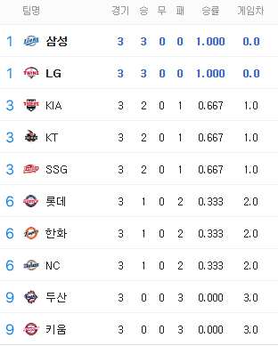아직 3경기째고 그동안 스토브리그와 지금까지 경기력을 참고한다면 기아 삼성 LG는 3강으로 보는게 맞는거 같고 kt와 한화 두산정도가 2자리 놓고 가능해보이네요