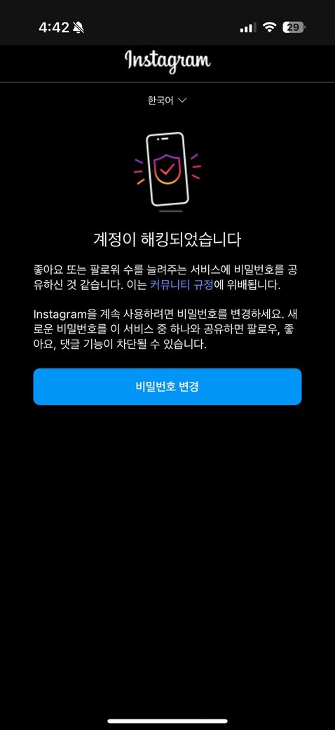 부계 새로 만들어서 강아지 인스타그램 만들고 팔로우 늘릴려고 좋아요 달고 팔로우 걸고 다니니깐 갑자기 계정이 해킹당했습니다. 라고 뜨고 막혀버렸어요.