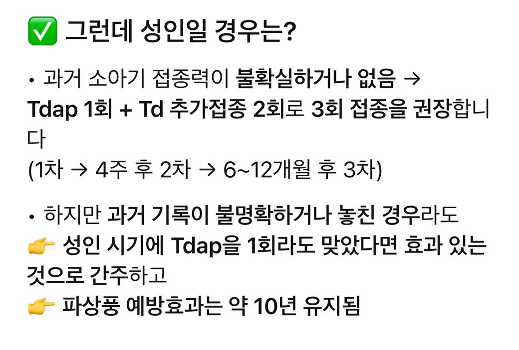 사진으로 올려주신 내용도 위와 동일한 내용으로 보이는데요, 일반적인 파상풍 접종이 아닌 질문자분께서 어떤 상황을 상정했기 때문에 그에 가정한 닺변을 한것으로 보입니다.