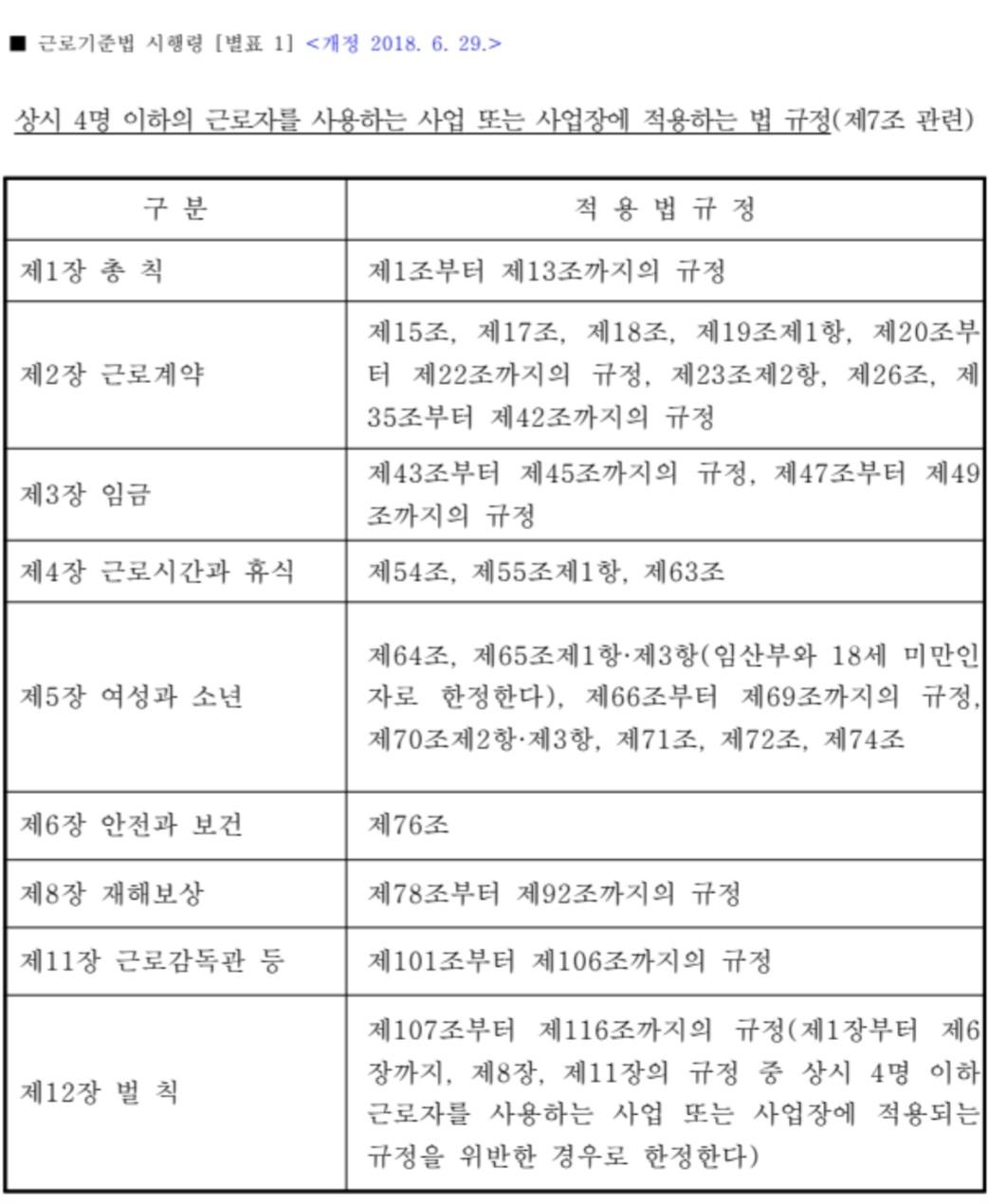 상시 4명 이하의 근로자를 사용하는 사업 또는 사업장에 적용하는 법 규정에 대해서는 근로기준법 시행령 별표1을 참고해보시기 바랍니다.