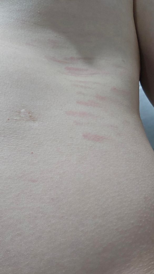 어느 순간부터 갑자기 배 쪽에 저렇게 할퀸 자국처럼 징그럽게 생기는데 왜그럴까요? 막 심하게 부풀거나 그러진 않는데 양쪽 다 그럴때도 있는데 오늘은 한쪽만 올라왔어요