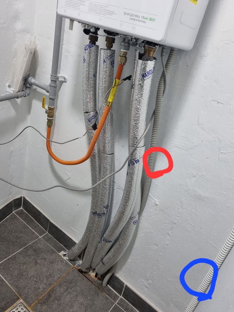 이게 단순히 에어컨 호스에서 떨어진 물이 고여서 보일러 호스에 묻은건지 보일러 호스에서도 물이 나온건지는 모르겠습니다.