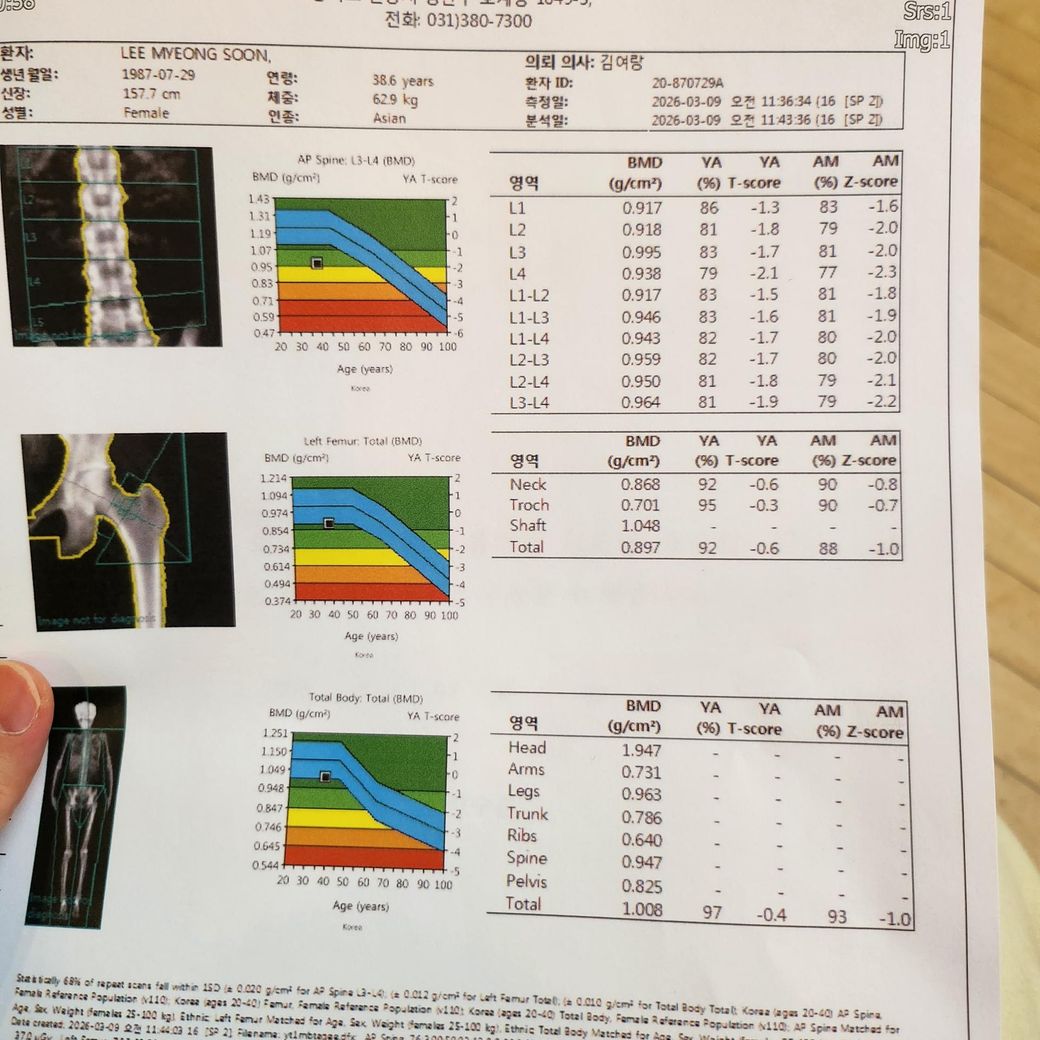 정리하면 현재 결과는 “척추 부위 경도 골감소증, 고관절과 전신은 정상”이며 출산 후 상황을 고려하면 비교적 흔한 패턴입니다. 대부분 시간이 지나면서 회복되는 경우가 많고 약물 치료가 필요한 단계는 아닙니다. 일반적으로 1년에서 2년 후 골밀도 재검을 통해 변화 여부를 확인합니다.