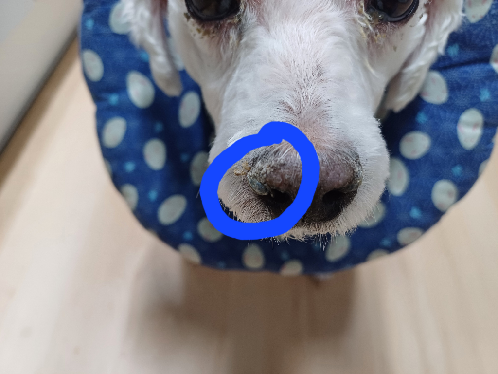 노령견에서 자주 보이는 코 각화 현상인데 일부는 질환상태, 일부는 정상적인 노화 상태인 경우가 있어 동물병원에 데려가서 진료 받아 보시는걸 권합니다.