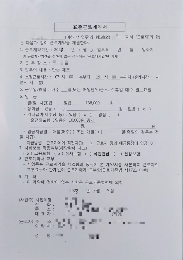 근로계약서를 작성했는데 용역회사를 통한 일이다보니 사업주(용역회사 사장)과 만나서 작성하지도 않고 서명도 하지 않았으며와 보시는 바와 같이 누락된 문항도 있었습니다. 이와 같은 상황에서 급여(주급)을 받았는데 초과근로수당은 물론 주휴수당 또한 포함되지 않은 오직 일급 138000원 5일치에 해당하는 690000원을 받았습니다.