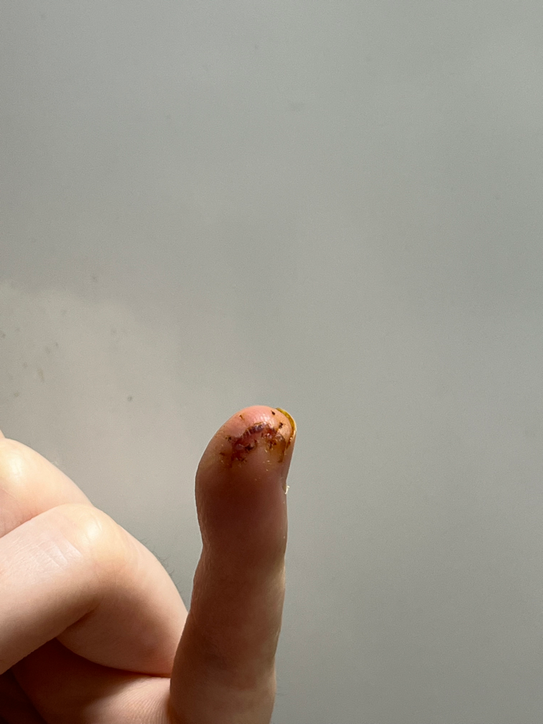 피가 굳으면 열상 부위에 달라붙어 있기 떄문에 일반적으로 떨어지지 않고 닦이지 않게 되는게 맞습니다. 현재 사진상으로는 실밥은 다 제거가 된 것으로 보입니다.