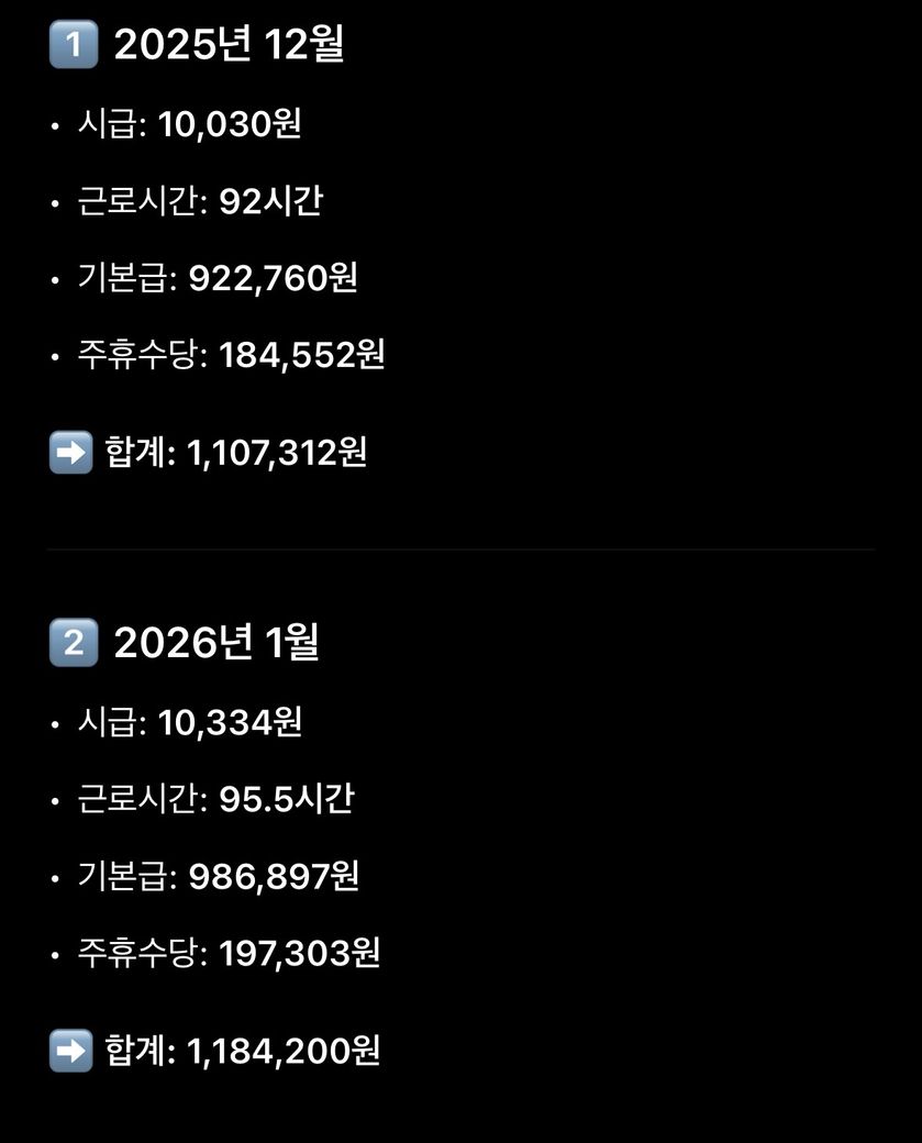 26년 1.2월은 기본급 10334 주휴2066
