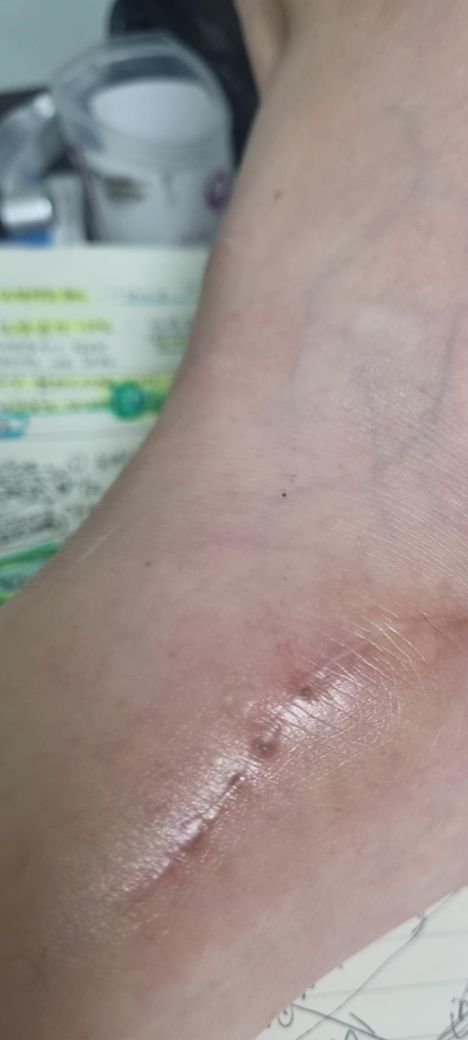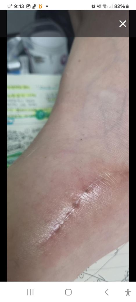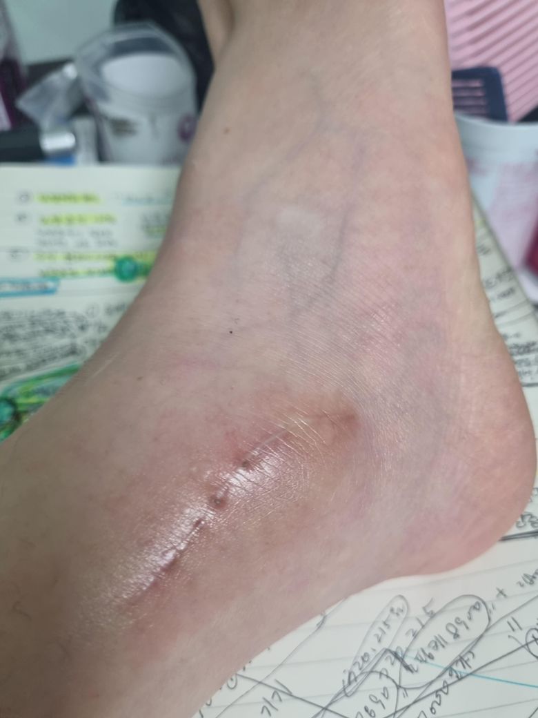 발목 판과 핀 수술받고 12주(만 3달)되었습니다 .수술부위 사진 부분 만지면 거칠함 .이 곳이 실인가요? 염증일까요?