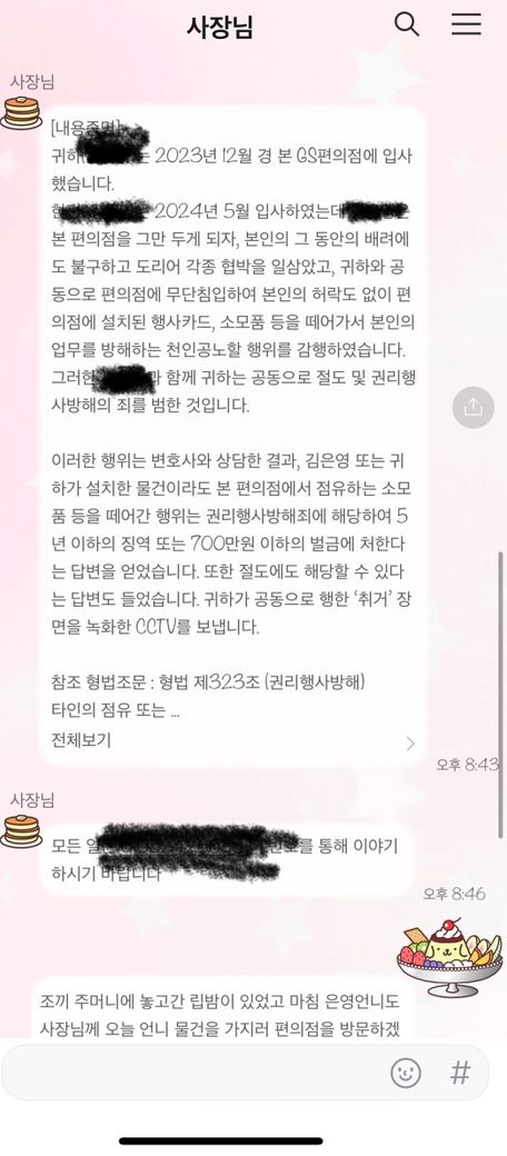 같이 알바를 그만두게 된 언니와 저는 사장님께 16일 오전 가게에 들러 개인소유 물건을 가져가겟다 말씀드렸고 언니와 제가 동행하여 물건을 가져왔습니다 그걸 씨씨티비로 보고 계셨는 지 그 날 저녁 카톡으로 내용증명을 보내시며 절도며 권리행사방해라며 협박을 하셨고 법률대리인이라고 연락하라고 하신 분은 변호사가 아닌 일반인이었습니다 또한 내용증명서의 내용을 살펴보면 제가 입사를 한 날짜를 잘못 기재했다는 점과 말의 논리가 맞지 않는 등 거짓으로 작성된 내용증명이 아닌지 의심이 됩니다 내용증명은 전자우편이나 우편으로 받아봐야하는 것 아닌가요?