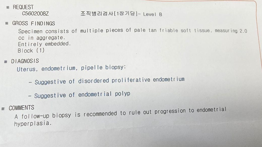 검사 결과 "무질서한 자궁내막증식"과 "자궁내막 폴립"이 의심된다고 나왔습니다. 이는 자궁내막증식증으로, 에스트로겐 과다로 자궁내막이 비정상적으로 두꺼워지는 상태를 말해요