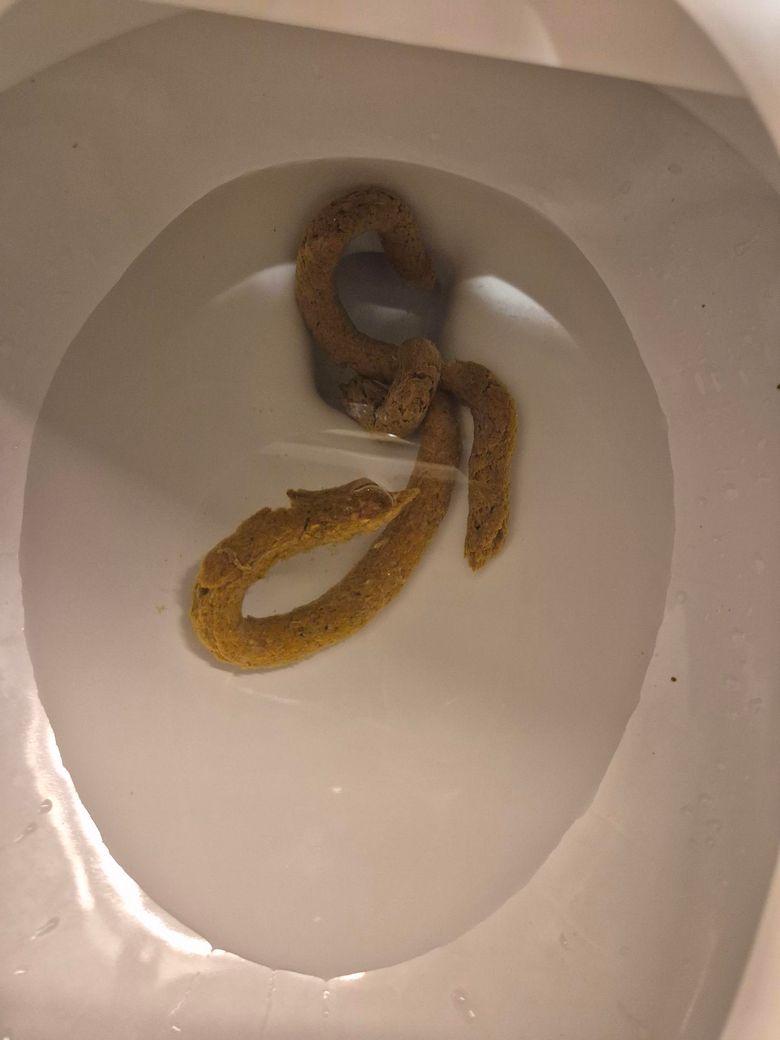 사진상 변은 형태가 유지된 길쭉한 모양으로 보이며, 묽게 풀어지지 않았고 물에 흩어지지도 않습니다. 일반적으로 사용하는 브리스톨 대변 형태 분류(Bristol stool form scale) 기준으로 보면 3형에서 4형 사이에 가까운 모습으로, 이는 대체로 정상 범주에 해당합니다.