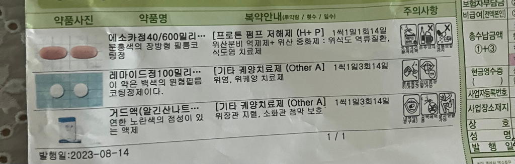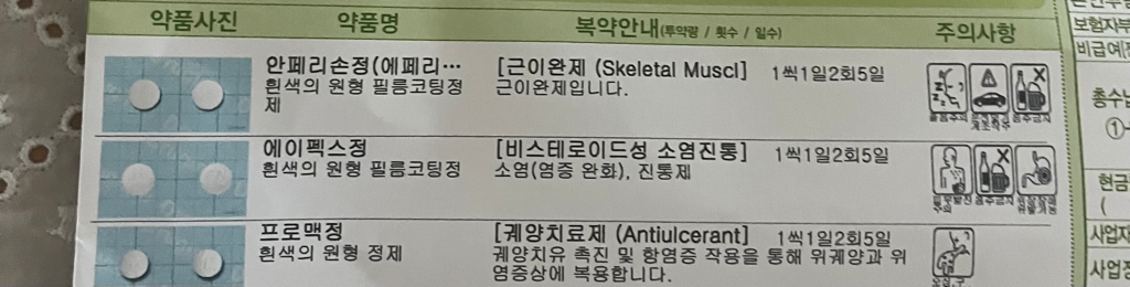 위장약은 식전, 정형외과약은 식후즉시, 마이보라정은 정해진 시간에 맞춰서 복용하시면 됩니다.