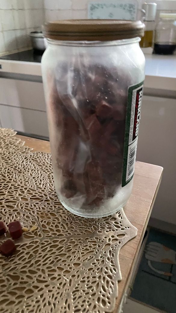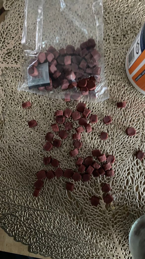 9kg 정도 되는 8~9살짜리 푸들이고 500g들어있는 미니 소고기 간식을 눈대중으로 보기에 400g 가까이 처 먹었습니다. 몸무게 비례 권장량은 20~40g을 추천하는 간식이고 되게 말랑말랑한 편입니다.