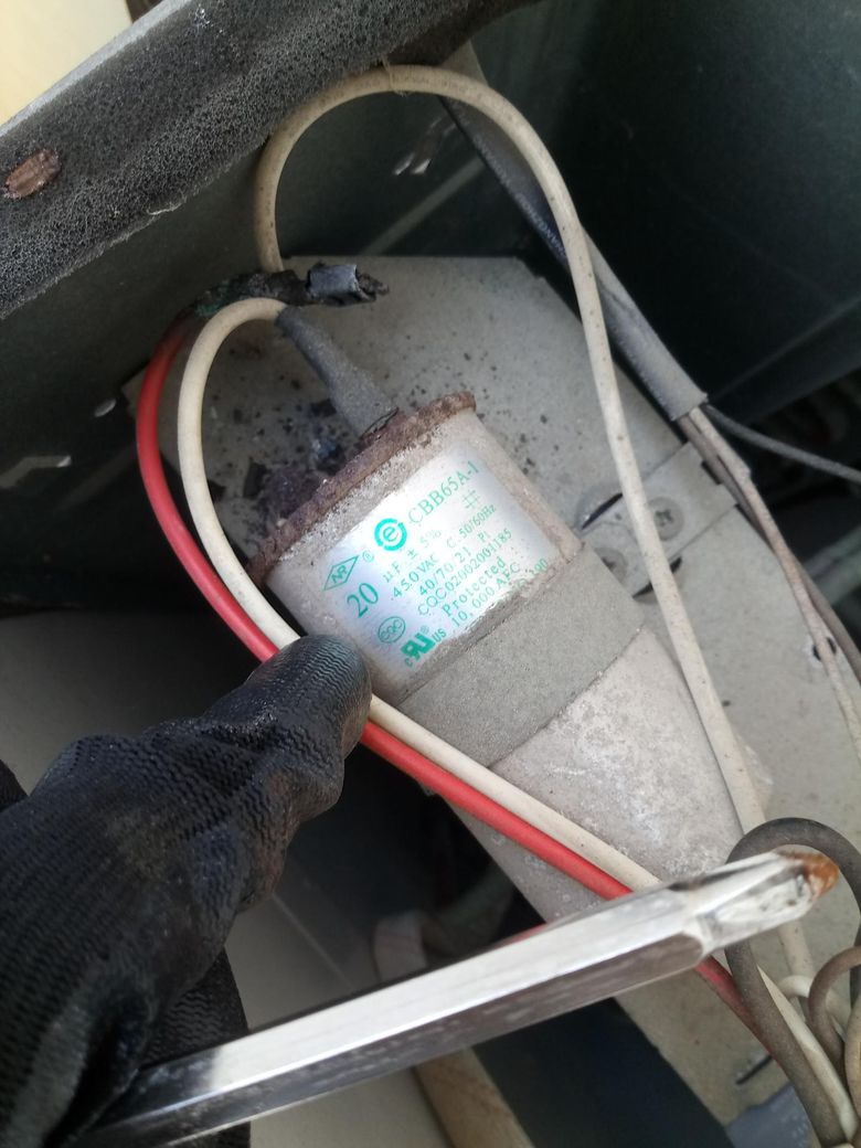 찬바람이 나오지 않고 실외기는 펜만 돌아가는 상황인데 실외기 안에 콘덴서 교체를 하면 에어컨 정상가동이 가능 하다는 이야기에 실외기 를 열어보니 콘덴서 연결 부위 가 녹에 의한 부식으로 망가져 있는것을 발견했습니다.