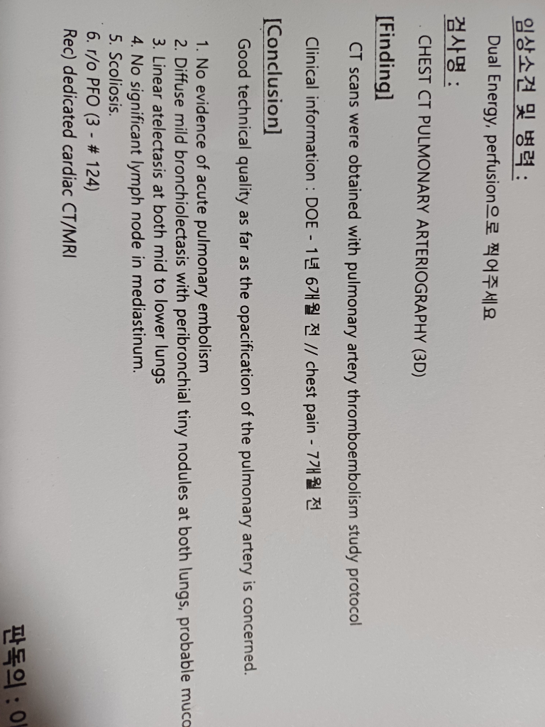 흉통, 숨참, 어지러움, 피로 증상으로 폐ct 결과 양쪽폐 중하부 선형 무기폐, 기관지확장증 등