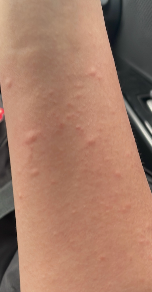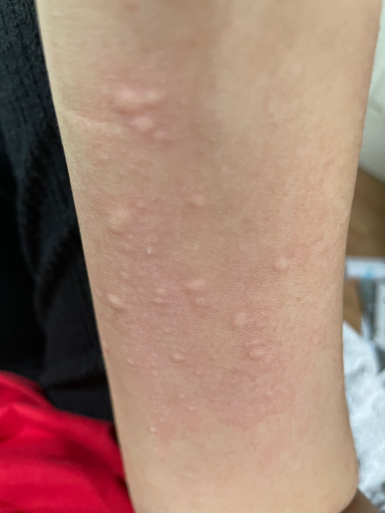 피부묘기증의 가능성도 있지만 두드러기 양상이 심한 상태이기 때문에 가까운 피부과에 내원하시어 정확한 진단 및 처방을 받으시는 것을 추천드립니다.