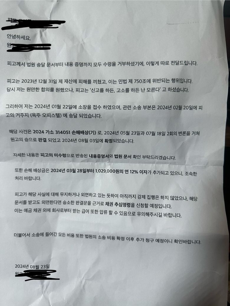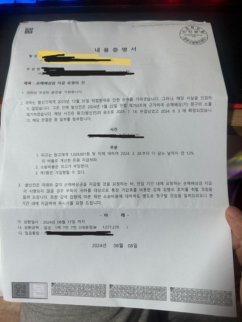 갑자기 손해배상 지급 이 날라와서 당황스럽습니다