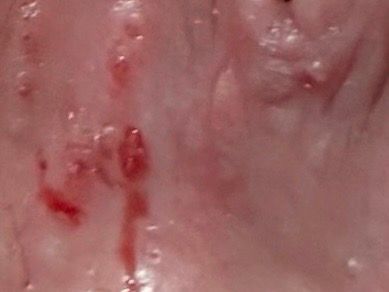 어제 저녁에 샤워하면서 뭔가 오돌토돌한게 만져져서 거울로 보니 피가 난것처럼 빨갛게 되어있고 질 입구 바로 주변에는 저렇게 동그란게 있는것처럼 보입니다. 혹시 곤지름일까요? 아니면 생리대를 너무 장시간 착용하고 있어서 그런걸수도 있나요?