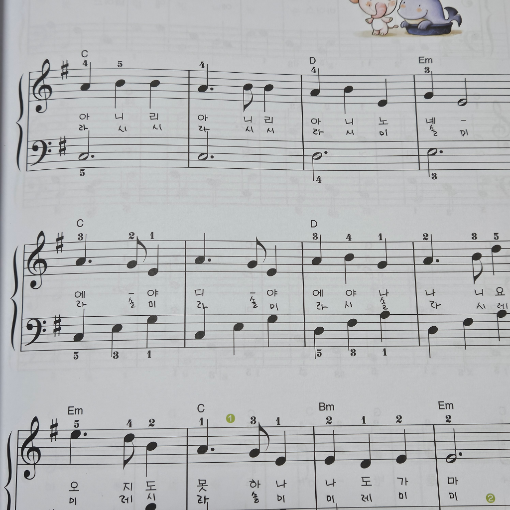 악보에서 음표 위에 있는 숫자는 손가락 번호를 말합니다. 그 번호를 보고 손가락 번호로 피아노 건반을 치는거죠. 낮은 음자리표의 음표에있는 번호는 왼손 손가락 번호를, 높은음자로표의 음표 위에있는 번호는 오른손 손가락 번호로써 같이 누르면서 그 박자 동안 누르면 됩니다.