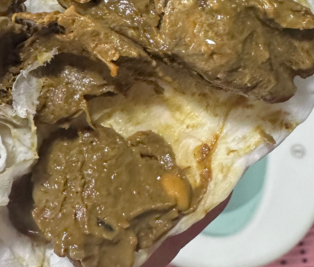 사진의 대변 소견에서는 딱히 문제가 있어 보이는 부분이 있어 보이지 않습니다. 다만 다소 묽은 것으로 보이며 땅콩버터 같이 지방이 포함된 음식을 섭취하여서 그런 것이 아닐까 싶습니다.