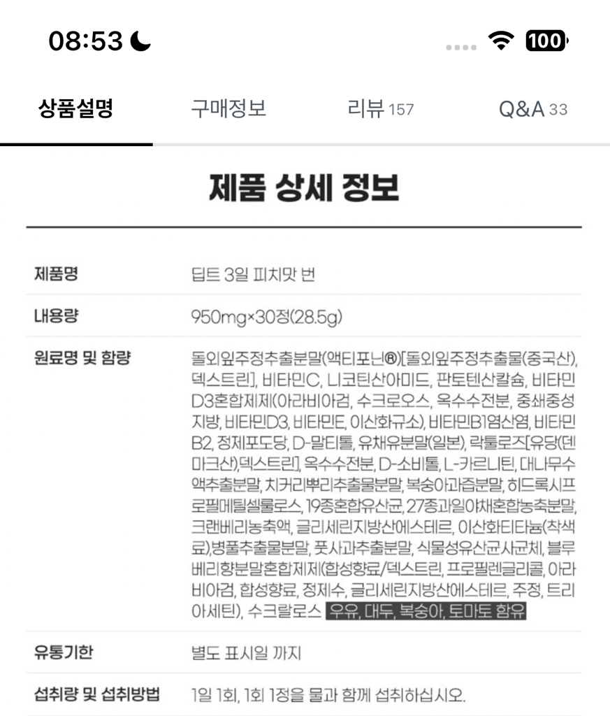 딥트 피치번은 체지방 감소에 도움을 줄 수 있는 기능성 성분인 액티포닌과 비타민 성분으로 구성되어 있습니다.