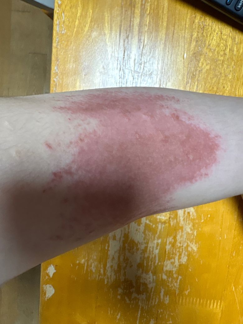 우선 사진 소견상 넓게 퍼진 홍반과 경계가 비교적 불규칙하며, 표면이 벗겨지거나 진물이 흐르는 모습은 뚜렷하지 않습니다. 긁힘(찰과상)이라면 선형으로 긁힌 자국이나 국소적인 표피 손상이 보이는 경우가 많습니다. 현재 형태는 마찰이나 열에 의한 표재성 화상(1도에서 얕은 2도 화상) 가능성이 더 높아 보입니다. 특히 넓게 균일하게 붉어진 양상은 열 접촉 또는 강한 마찰에서 흔합니다.