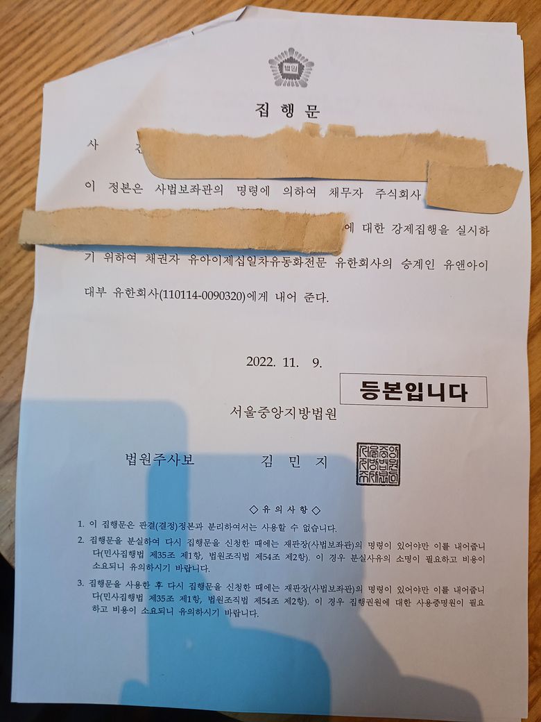 10년지난 채무인데 갑자기 법원 집행관송달로 이런서류가 왔는데 무엇인가요?