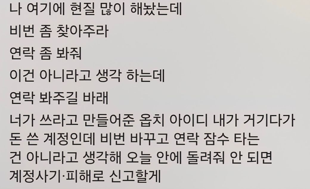 알고 지내던 사람과 같이 게임을 하기 위해 제 명의로 계정을 만들어서 빌려줬었습니다. 그 이후에 2024년12월 이후로 연락을 하지 않고 지냈습니다. 그런데 얼마전 연락이 와서 제가 만들어서 빌려준 계정의 이메일 정보를 본인꺼로 변경해달라는 연락이 왔고, 저는 다시 엮이고 싶지 않아서 연락을 받지 않았습니다. 그 이후 얼마전인 11월25일에 그때 만들어준 아이디에 본인 현금으로 게임 현금성 아이템(캐시)을 많이 구매해서 사용 했었는데 비밀번호좀 찾아줄수 있겠냐고 연락이 왔습니다. 저는 엮이고 싶지 않아서 또 한번 연락을 받지 않았고, 추가로 연락이 와서 제가 쓰라고 만들어준 아이디에 본인이 거기에다 돈 쓴 계정인데 비번 바꾸고 연락 안받는다고 오늘 안에 안 돌려주면 계정사기 피해로 신고하겠다라는 연락을 받았습니다. 저는 그동안 그 계정을 사용 한 적도 없고 비밀번호 변경도 한 적이 없으며 상대방은 그동안 1년 가까이 연락을 하지않고 지냈는데도 꾸준히 제 계정을 사용하며 게임내 현금성 아이템을 구매하며 사용하고 있던겁니다. 그래서 제 이메일을 확인해보니 계정은 도용 의심으로 주의 메세지가 수차례 와 있었고, 그로 인해 제재 처리로 게임사 측에서 비밀번호 초기화 제재를 내린거였습니다. 금전으로 계정 거래를 한 적도 없고, 그저 아이디가 없다고 하여 제 명의로 가입을 하고 잠시 빌려줬던건데 제가 사기를 친건가요?