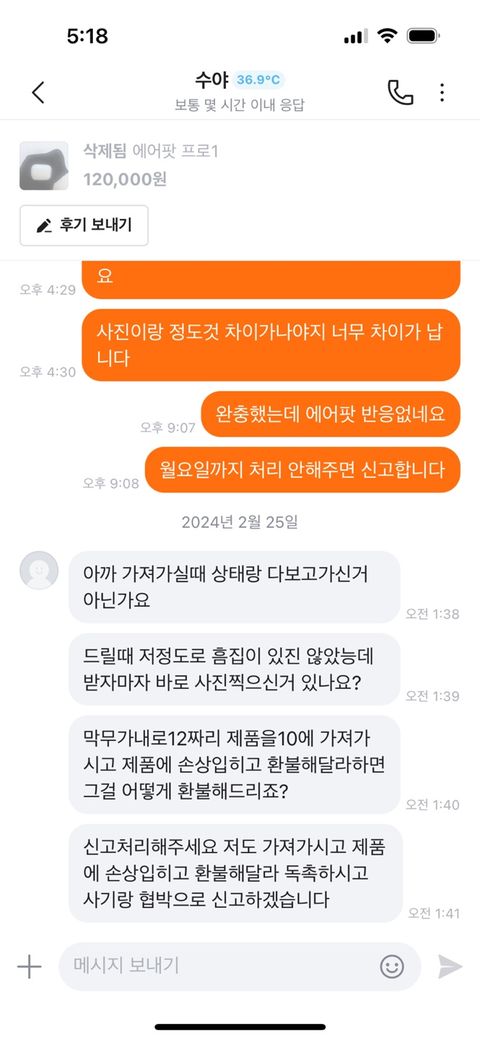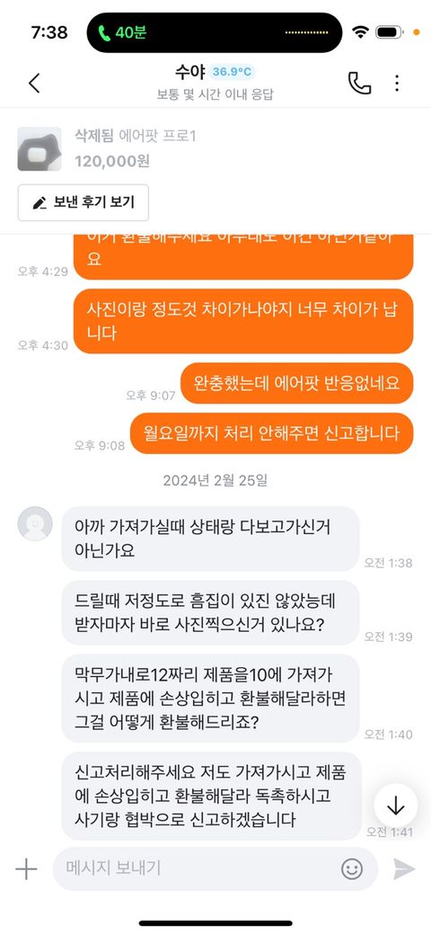 신고해라 멀쩡한거 가져가서 고장내고 환불한다고 사기죄 협박죄로 신고한다고 하던데요