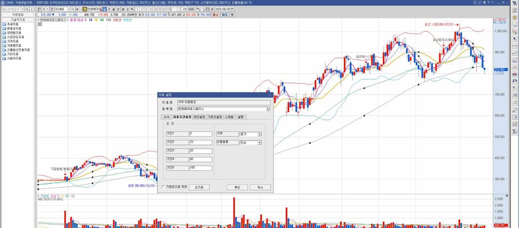 키움증권 영웅문4(HTS)에서 주가 이동평균선(MA)을 기본 5개(5, 10, 20, 60, 120일) 이상 추가하려면