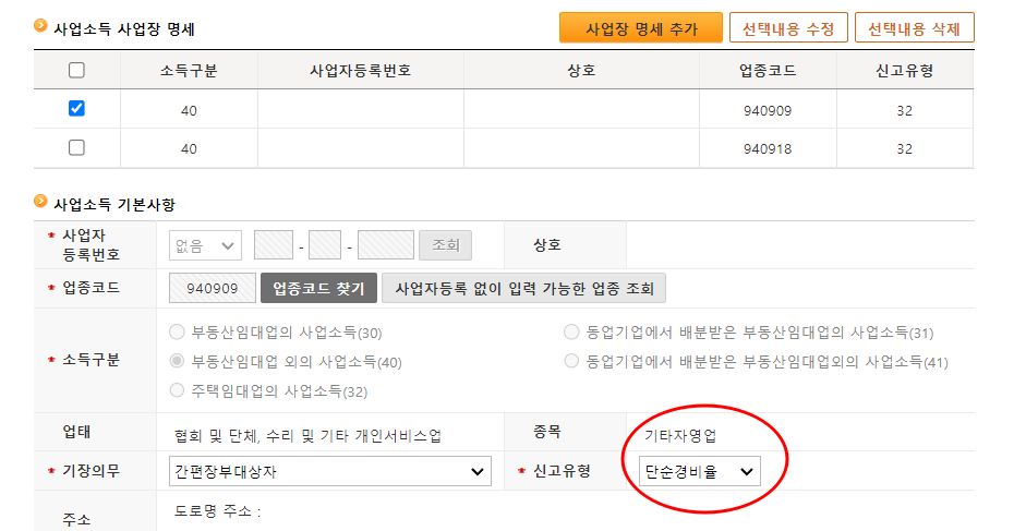 업종코드별로 각각 아래 그림 처럼 신고유형을 단순경비율로 체크 하면 안되나요? 현재 총 수입 금액이 1번 2번 합쳐 이미 3600만원을 넘었기 때문에 무조건 각각 기준경비율로 체크 해야만 하는 건지 궁금합니다!