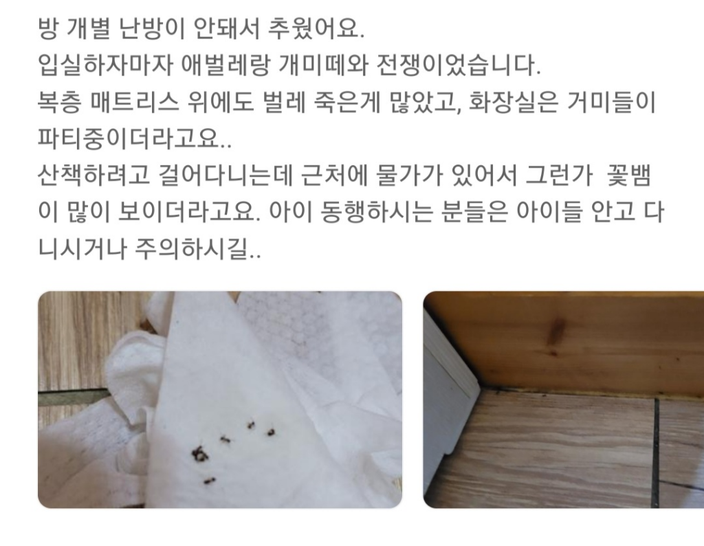 2023년 9월27일~ 2박을 펜션에서 지냈었는데,여러 불편한점이 있었어서 한줄 후기에 올렸었습니다.